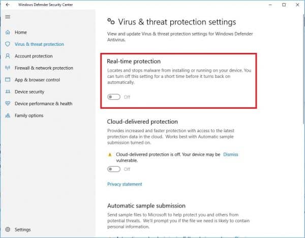 – Chuyển trạng thái tùy chọn từ ON sang OFF của Real-time protection.