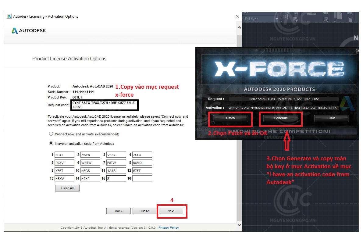 Bước 6: Đến đây mình copy“Request code” ==> dán vào “Request” bên cửa sổ X-FORCE tiếp đó click “Generate”. Tiếp tục click “Patch” và xuất hiện code trong phần “Activation” tại cửa sổ X-FORCE, nếu cóthông báo “Successfully patched” thì có nghĩa bạn Patch đã thành công! Nhấn “OK” để tắt thông báo này đi.