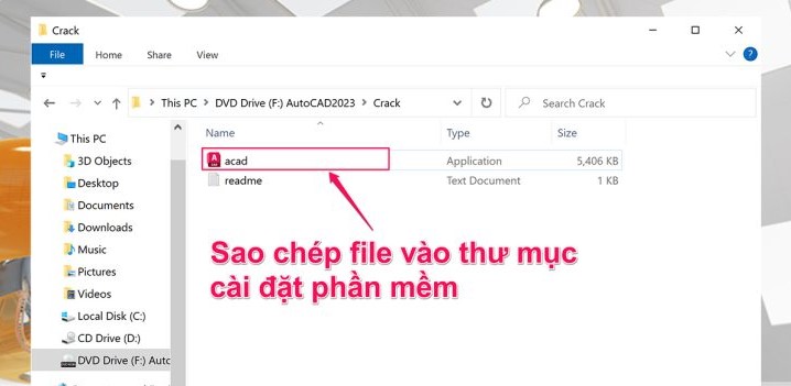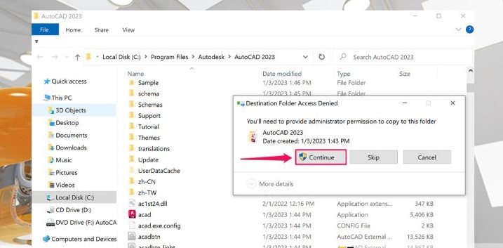 Lưu ý: Nếu bạn không copy được file crack “acad” vào thư mục cài đặt AutoCAD 2023. Có thể bạn đã cài đặt AutoCAD trước đó rồi, nên AutoCAD chặn quyền truy cập thư mục. Trong trường hợp này thì bạn hãy gỡ phần mềm ra và cài đặt vào 1 thư mục khác (không cài vào thư mục cài đặt mặc định: C:\Program Files\Autodesk\AutoCAD 2023)