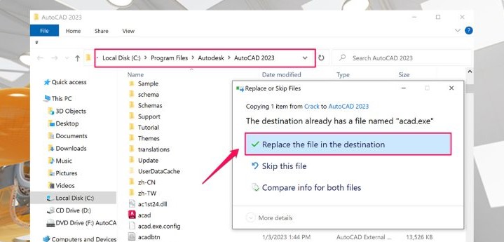 Bước 2: Tìm ổ cài đặt phần mềm AutoCAD 2023 lúc đầu. Nếu giữ nguyên ổ C thì bạn hãy tìm theo đường dẫn: C:\Program Files\Autodesk\AutoCAD 2023. Tại đây, bạn dán file “acad” vào => chọn Replace the file in the destination.