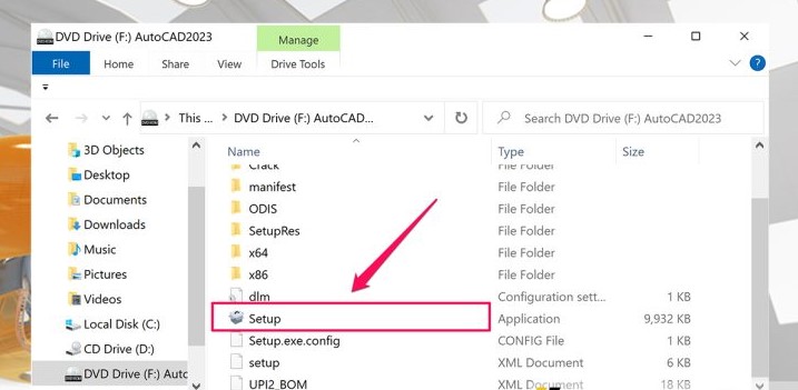 Bước 3: Sau khi chuyển qua ổ đĩa ảo, click đúp chuột vào file Setup để tiến hành cài đặt AutoCAD 2023 cho thiết bị.