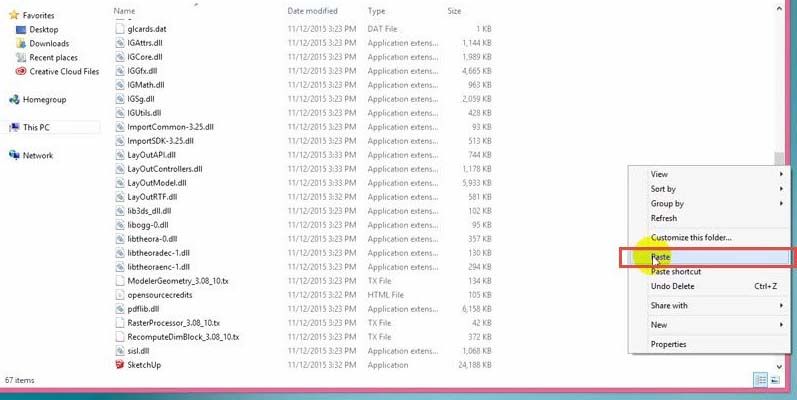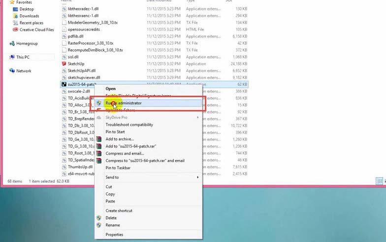 B2: Tiếp theo thì bạn Copy file Crack ở trên và click phải chọn Paste vào thư mục cài của Sketchup. Sau đó nhấp chuột phải và chọn ‘Run As Administrator’ để chạy dưới quyền admin